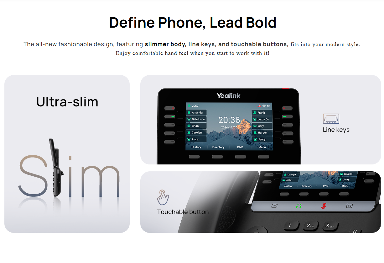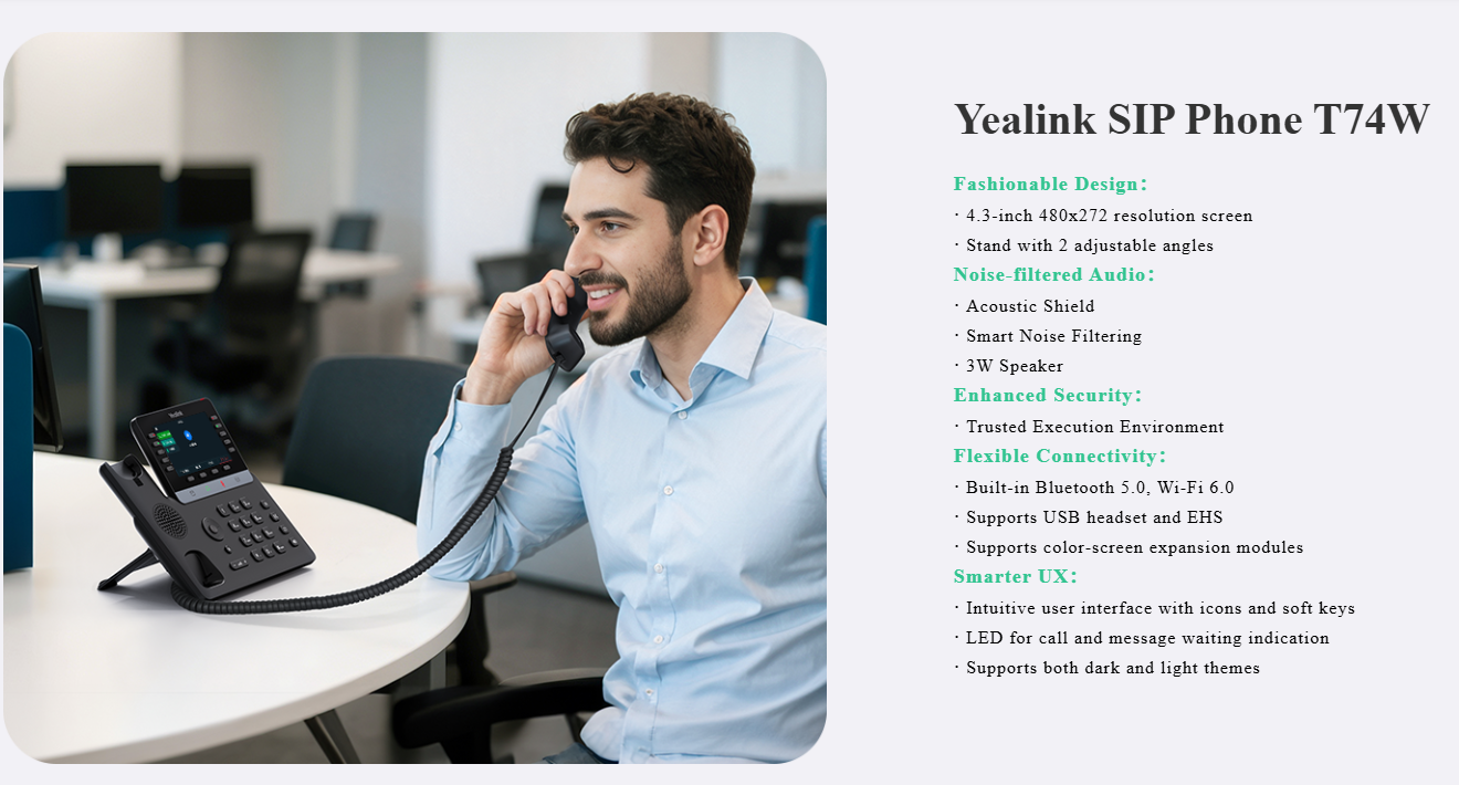 SIP-T74W zaawansowany telefon IP serii T7 z Wi-Fi oraz Bluetooth to nowoczesny, elegancki telefon biurkowy klasy biznes, łączący wygodę pracy bez kabli, wysoką jakość audio i rozbudowane funkcje bezpieczeństwa. Idealny do biur, w których wymagana jest wysoka jakość połączeń, wiele linii SIP oraz mobilność wynikająca z łączności bezprzewodowej.